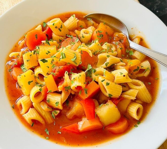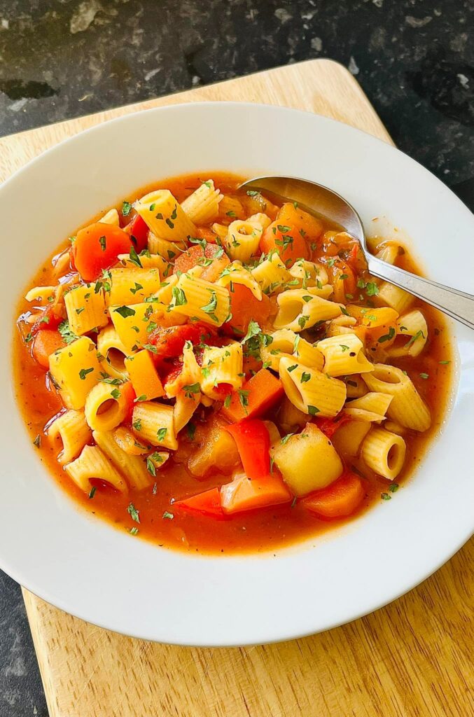 Chunky vegetable minestrone soup is simply a nice Mediterranean soup traditionally with pasta strips or rice through it but I like to make mine with larger pasta such as penne to make sure that my soup is a little more filling and with just a little more bite.