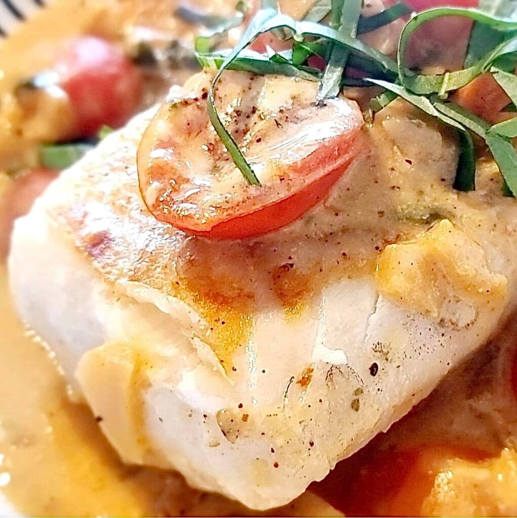 Pan seared cod fillets with tomato, basil and white wine sauce.
