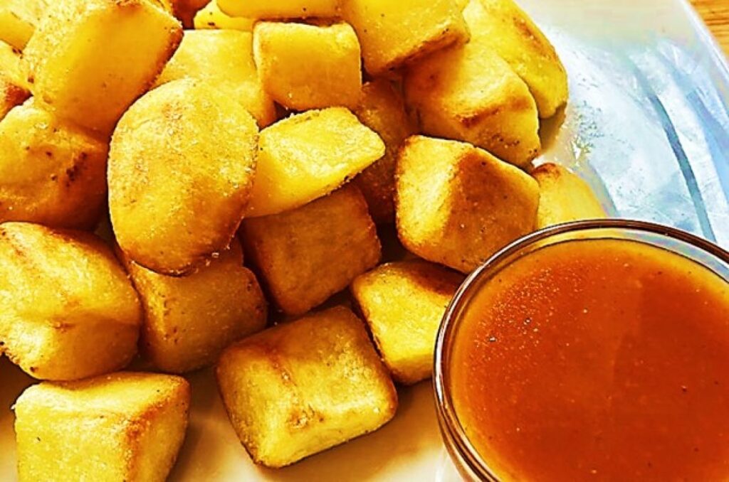 Traditionally, the potatoes are cut into small cubes and deep-fried in olive oil until golden and crispy, then generously dressed with a smoky, sweet, and spicy paprika-infused sauce.