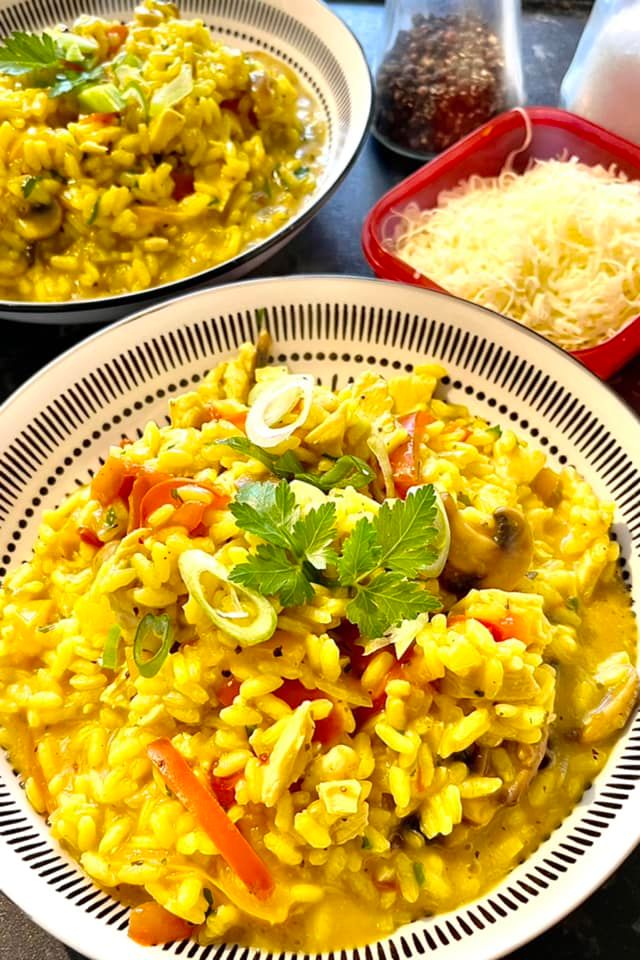 This very creamy Saffron Chicken & Mushroom Risotto is the ultimate comfort food and is so easy to make. It may even become your go-to dish for entertaining friends or just to immerse yourself in whilst cosying up on the sofa watching your favourite box set.