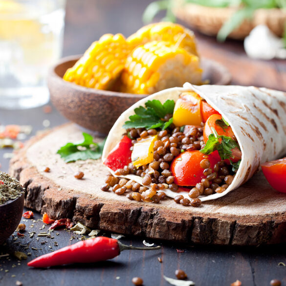 - Wrap the tortilla into a burrito shape and cut in the middle.